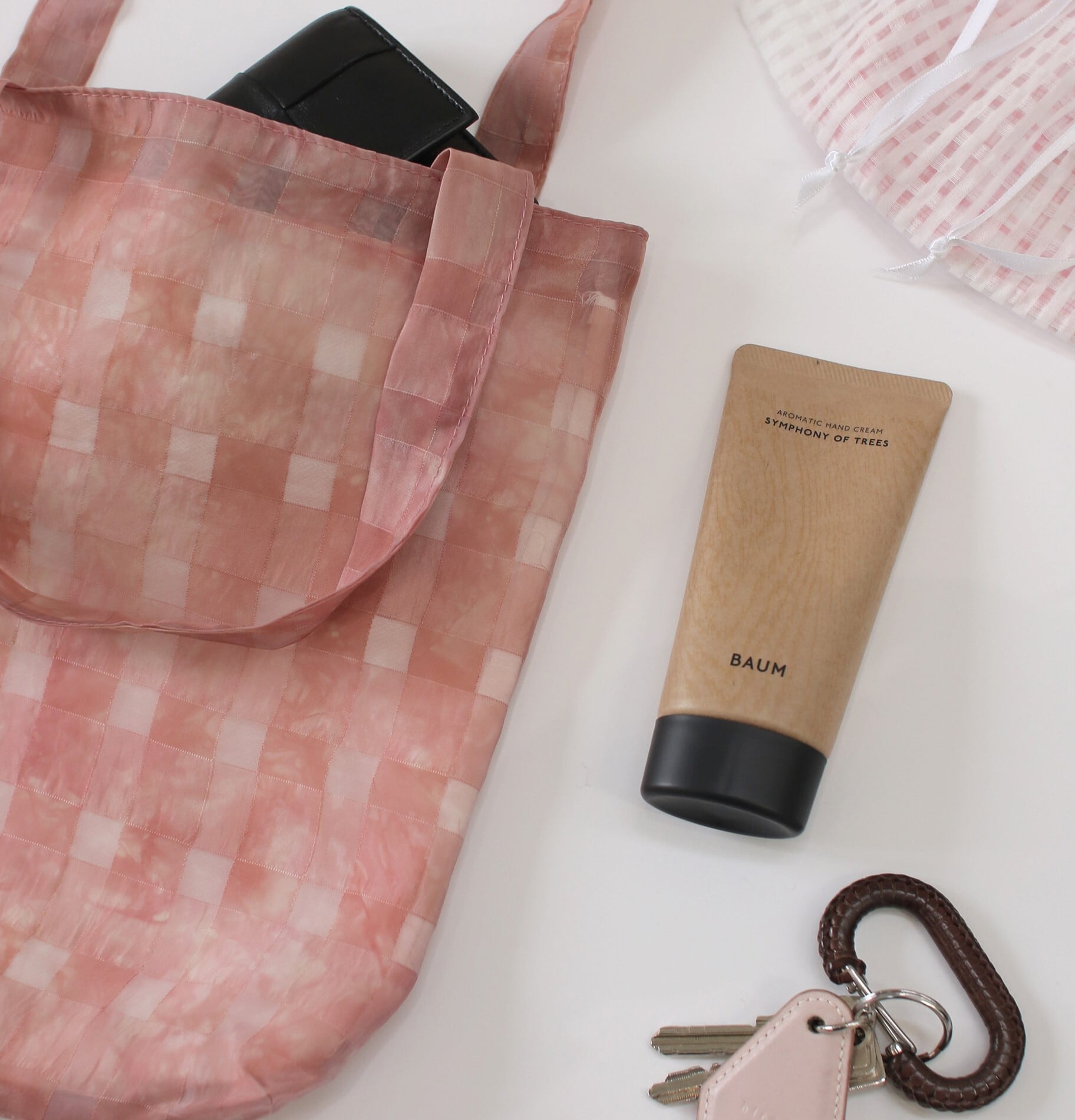細かいステッチが入った格子柄のジャカード生地をオリジナルカラーに籠染をした裏地付きのミニトートバッグ。